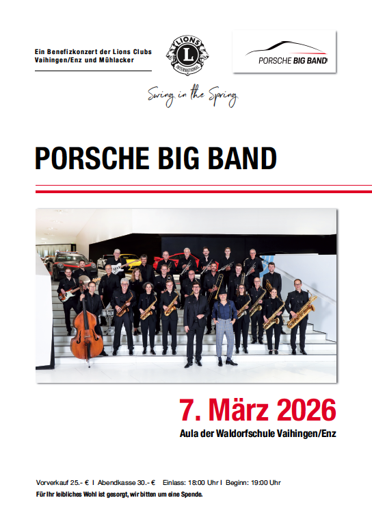 Am 7. März 2026 erwartet Sie in der Aula der Waldorfschule in Vaihingen etwas ganz Großes: die Porsche Big Band gestaltet gemeinsam mit den Lions Clubs Vaihingen/Enz und Mühlacker ein Benefizkonzert. Ab 19:00 Uhr startet der musikalische Auftakt in den Frühling, Konzertkarten sind im Vorverkauf (Vaihinger Mühle) für 25,- €, an der Abendkasse für 30,- € erhältlich. Die Mitglieder der Lions Clubs sorgen vor dem Konzert sowie in der Pause in bewährter Manier für Ihr leibliches Wohl. Der Gesamterlös des Konzertes kommt wie gewohnt den karikativen Unterstützungsprogrammen beider Clubs zugute.